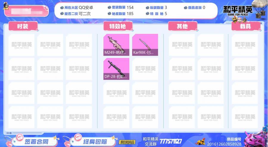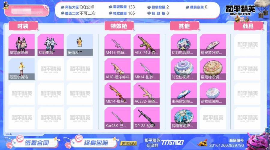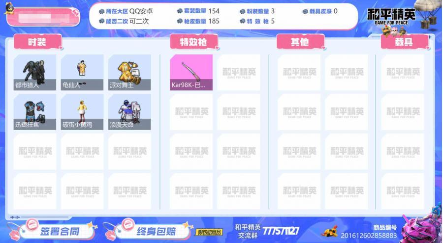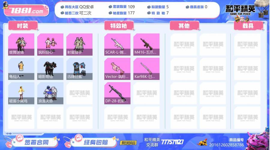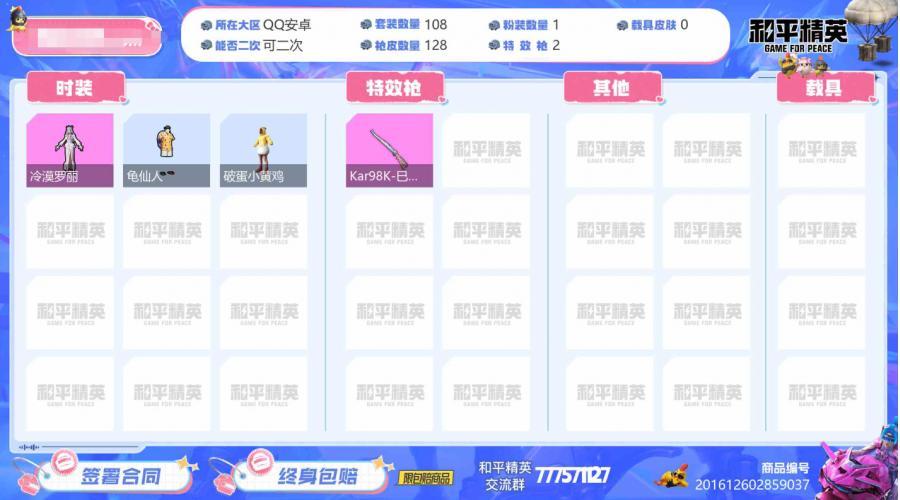 有二次【地铁满天赋1粉装-2特效枪小丑鱼】 安卓手Q-1粉装-2特效枪-108套装-128枪皮-2王牌印记-坚韧铂金Ⅳ-31685热力值【1粉装】角色-冷漠罗丽【2特效枪】Kar9【王牌印记数量:2套装数量:108枪皮数量:128粉装数量:1特效枪数量:2优质套装:冷漠罗丽热门套装:2个龟仙人,破蛋小黄鸡热门枪械:Kar9区服类型: 和平精英 |