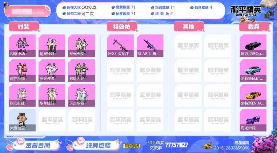 【王牌印记数量:4 套装数量:71 枪皮数量:71 粉装数量:11 特效枪数量:2 优质套装:圣光天使,霞光圣骑,寒光使者,闪耀律动,碧影闪光,天之羽翼,甜心娃娃,精灵娃娃,酣梦娃娃 热门套装:1个 大橘为重 热门载具:4个 玛莎拉蒂Quattroporte(夜幕蓝),路特斯ELETRE(冰川蓝),路特斯EVIJA(星际黄),海龙奔腾 热门枪械:SCAR-L-青春物语,MG3-炙焰牛王】11粉装2特效枪4载具4印记可二次可修改实名【热门装扮】蜀山剑侠-李逍遥,梦幻火箭(新101),精灵娃娃,酣梦娃娃,甜心娃娃,天之羽翼区服类型: 和平精英 |