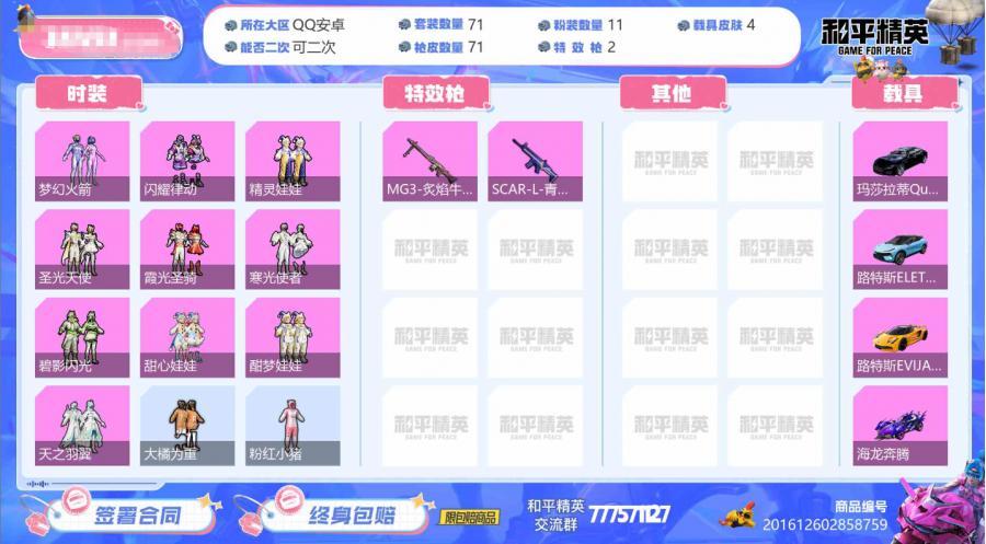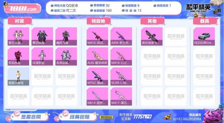 安卓 手Q-6粉装-13特效枪-2载具-1粉色飞行器-48479热力值-4王牌印记-92套装-160枪皮 【粉色套装】:粉装-炙焰赤龙,粉装-飓风飞鹰,粉装-青空秋雨,粉装-第五大【王牌印记数量:4套装数量:92枪皮数量:160粉装数量:6特效枪数量:13优质套装:第五大道,冷漠罗丽,未来歌姬,青空秋雨,炙焰赤龙,飓区服类型: 和平精英 |
