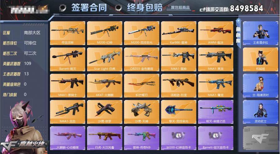 【可二次 英雄武器数量:56 英雄角色数量:2 王者武器数量:2 传说影煞 M4A1-黑骑士音效卡 幻神-AG-CFPL S24冠军 白虎-大汉风骨 龙啸-巅峰荣耀,无影-神兵利器,烈火-动感闪耀 稀有武器:14个 】河南一区-58V-2王者-3炫金【传说角色】:传说影煞【热门武器】:QBZ03-金色蔷薇,ScarLight-白虎,HK417-朱雀,M200区服类型: 穿越火线 |